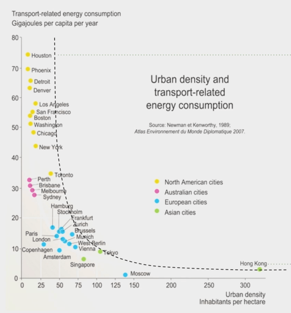 To start, due to less necessity placed on fossil-fuel burning transportation, from a denser community, there is less energy consumption; many United States cities veer towards the left of this graph. Beyond this, denser cities have also been proven to be more productive and creative, potentially due to the environments they tend to foster. At the same time, however, there may be penalties for urban psychological health.